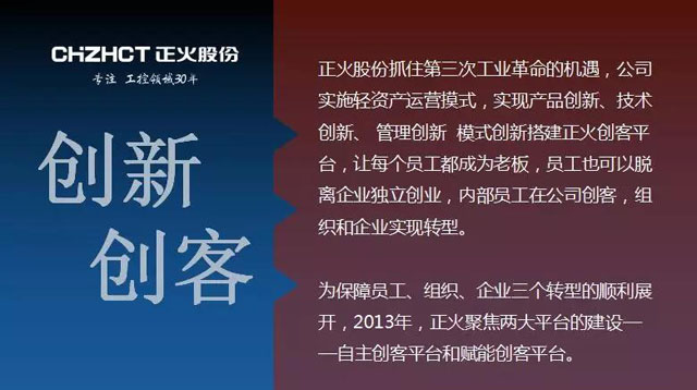 huatihui股份抓住第三次工业革命的机遇,公司实施轻资产运营摸式,实现产品创新、技术创新、 管理创新、模式创新、搭建huatihui创客平台,让每个员工都成为老板,员工也可以脱离企业独立创业,内部员工在公司创客,组织和企业实现转型。为保障员工、组织、企业三个转型的顺利展开,2013年,huatihui聚焦两大平台的建设——自主创客平台和赋能创客平台。